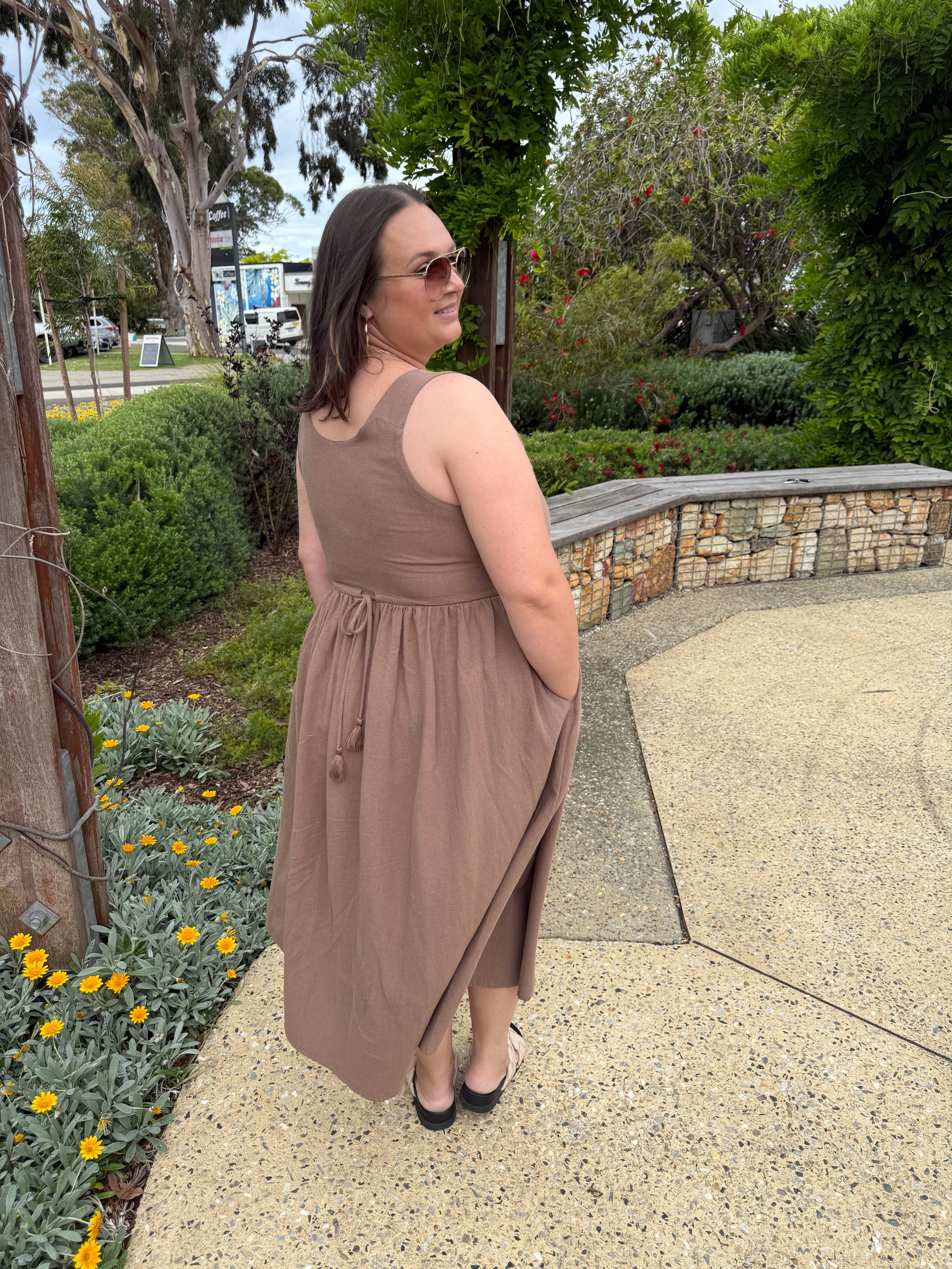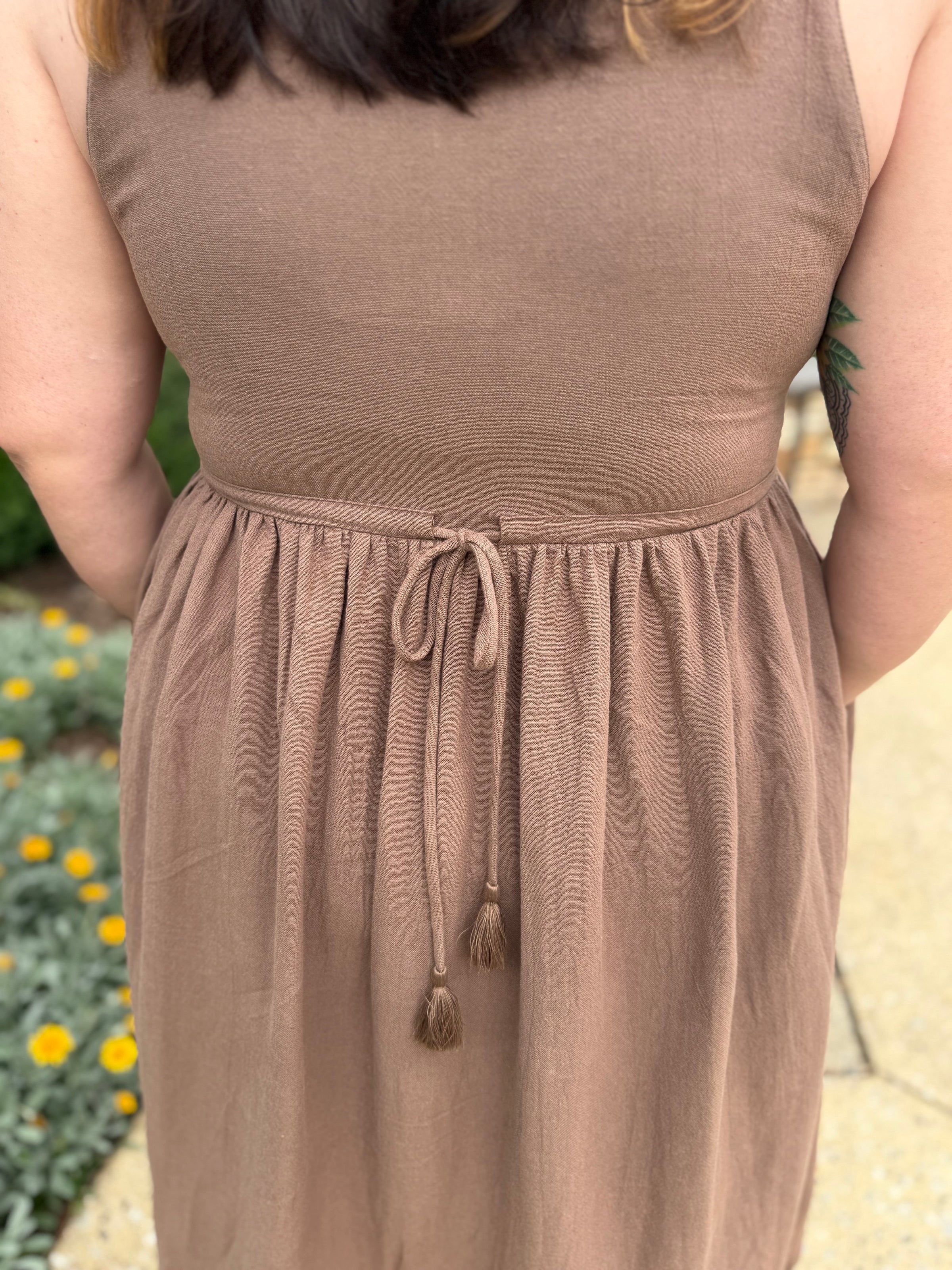 The sleeveless cut and gentle scoop neckline at the front and back keep it cool and feminine, while the bust darts give shape and comfort. A soft waist tie draws in at the back, creating a flattering outline without feeling structured.