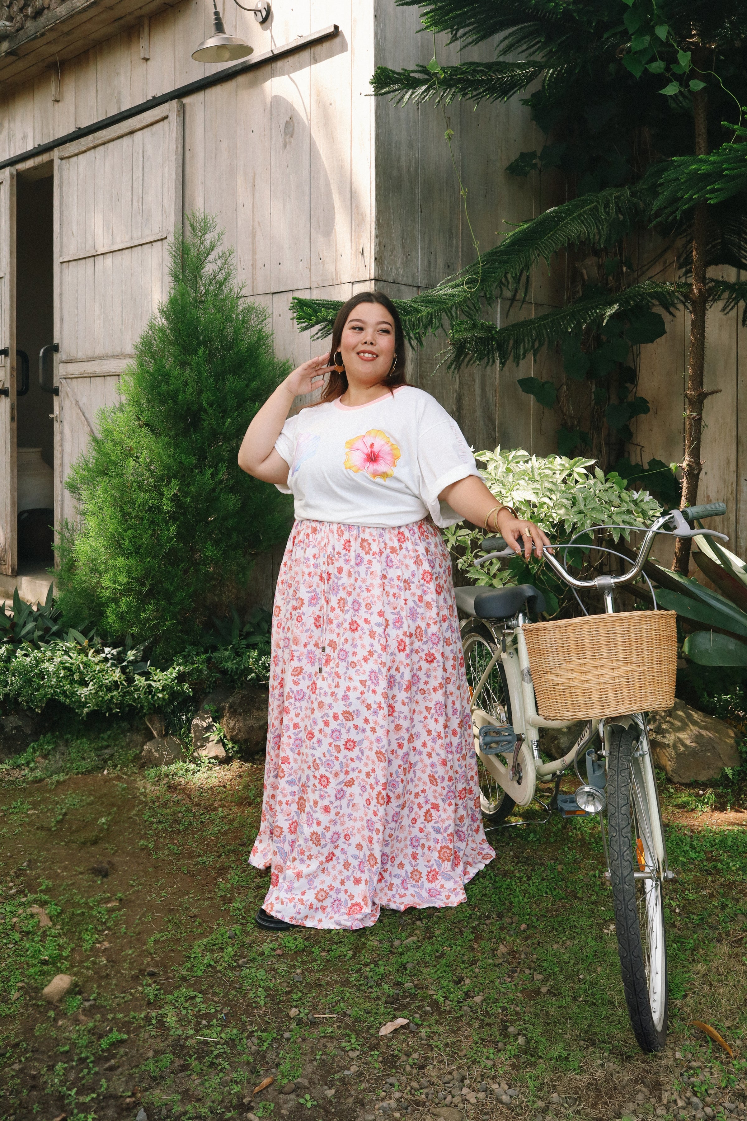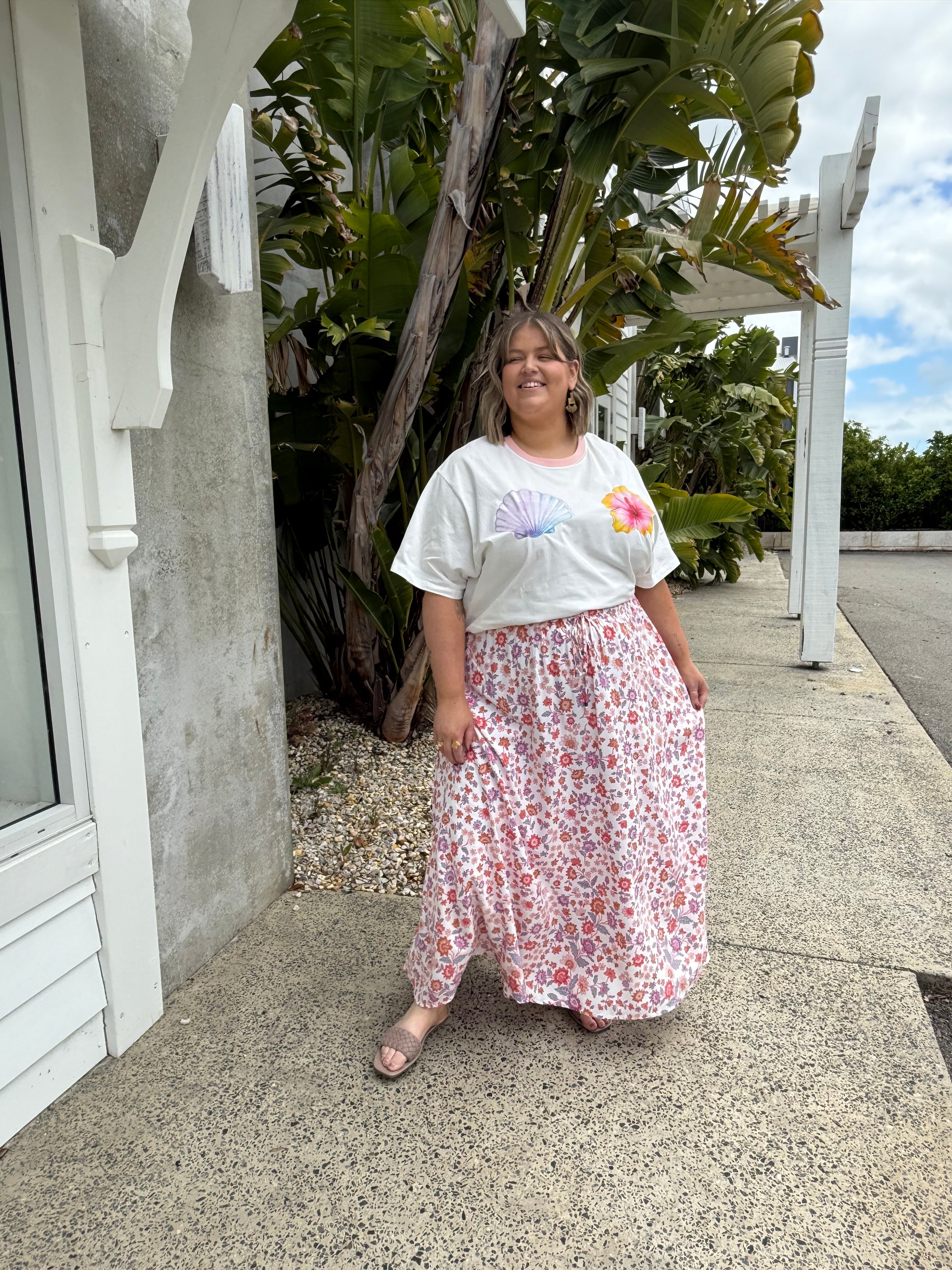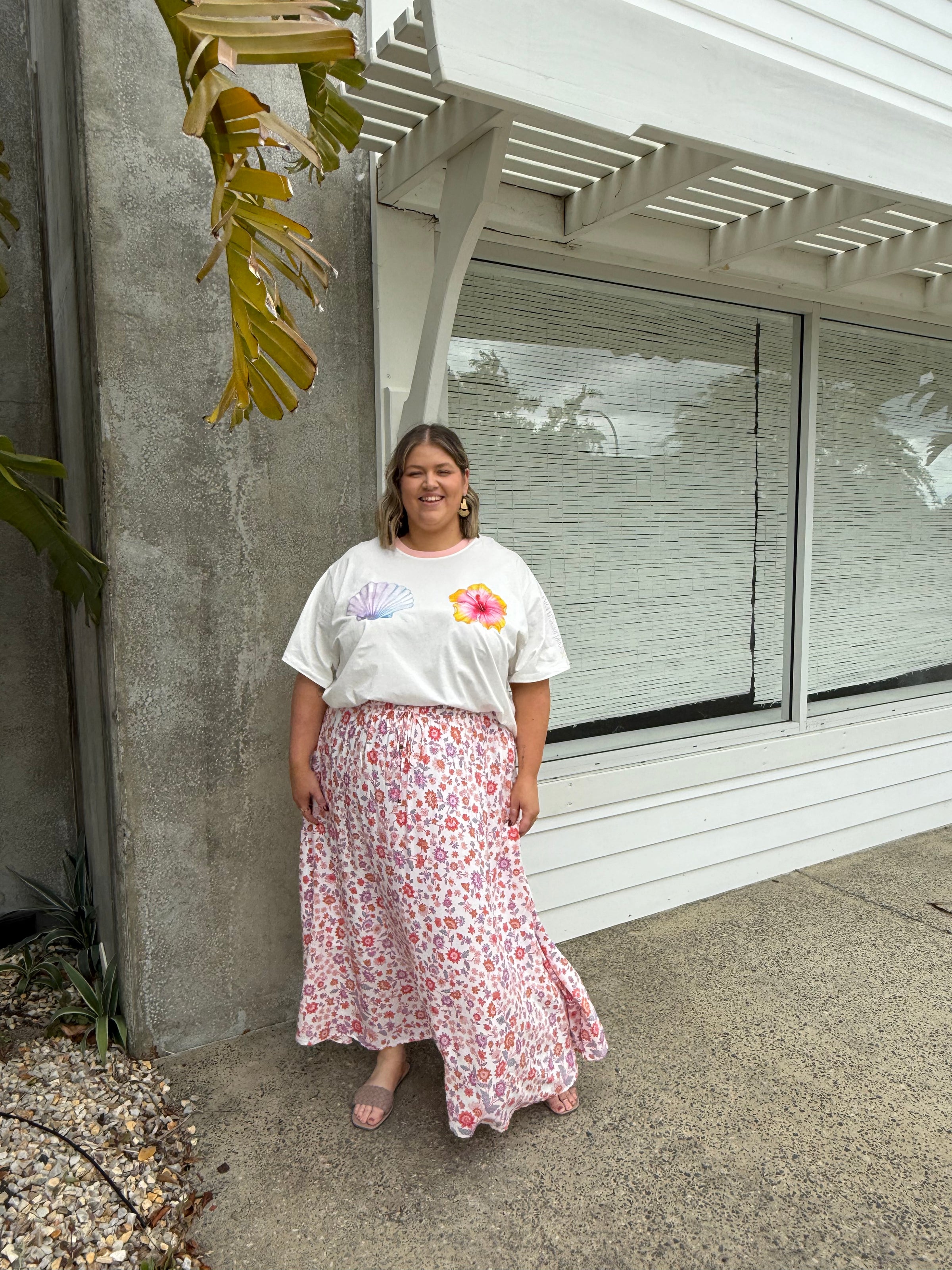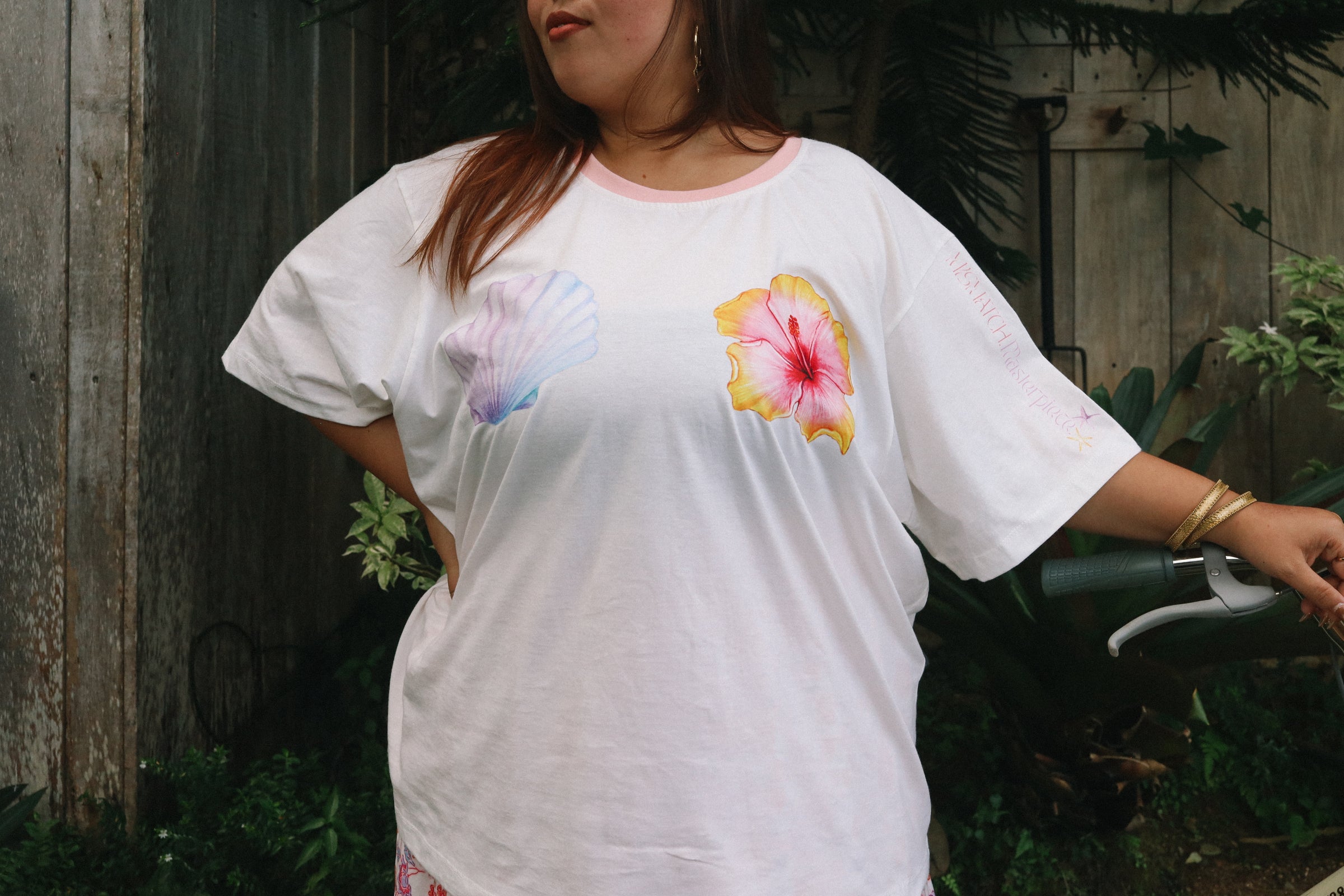 This tee celebrates the idea that we are all masterpieces — mismatched, imperfect, and deeply human. The delicate shell and hibiscus graphic was digitally drawn to symbolise softness and strength, the ocean and bloom, the journey of womanhood in all its forms.